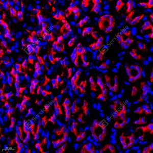 IF检测Anterior Gradient 2蛋白(货号 GB111327)(红色). 样品: 人乳腺癌, 4%多聚甲醛 (货号G1101) 固定12-24小时. 抗原修复: Tris-EDTA抗原修复液(pH 9.0) (G1203), 98℃, 20分钟. 封闭: 3% BSA(货号GC305010)的PBS溶液, 室温孵育30分钟. —抗: 1: 2000稀释, 4℃ 孵育过夜. 二抗: Cy3标记山羊抗兔IgG (H+L) (货号GB21303), 1: 300稀释, 室温孵育1小时. |