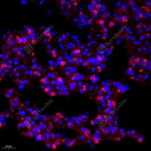 IF检测ADAMTS1蛋白(货号 GB111350)(红色). 样品: 小鼠肺, 4%多聚甲醛 (货号G1101) 固定12-24小时. 抗原修复: Tris-EDTA抗原修复液(pH 9.0) (G1203), 98℃, 20分钟. 封闭: 3% BSA(货号GC305010)的PBS溶液, 室温孵育30分钟. —抗: 1: 1800稀释, 4℃ 孵育过夜. 二抗: Cy3标记山羊抗兔IgG (H+L) (货号GB21303), 1: 300稀释, 室温孵育1小时. |