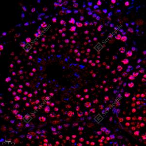 IF检测ADAMTS1蛋白(货号 GB111350)(红色). 样品: 小鼠睾丸, 4%多聚甲醛 (货号G1101) 固定12-24小时. 抗原修复: Tris-EDTA抗原修复液(pH 9.0) (G1203), 98℃, 20分钟. 封闭: 3% BSA(货号GC305010)的PBS溶液, 室温孵育30分钟. —抗: 1: 1800稀释, 4℃ 孵育过夜. 二抗: Cy3标记山羊抗兔IgG (H+L) (货号GB21303), 1: 300稀释, 室温孵育1小时. |