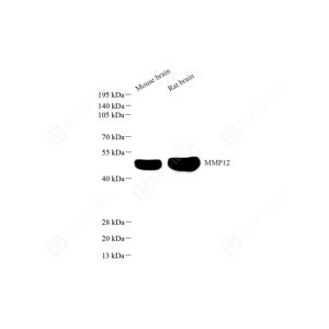 WB检测MMP12蛋白(货号 GB115475). 样品: 经RIPA裂解液(货号G2002)处理的蛋白质. 封闭: 封闭: 3%脱脂牛奶(货号GC310001)溶于TBST溶液, 室温孵育1小时. —抗: 1: 500稀释, 4℃ 孵育过夜. 二抗: HRP标记山羊抗兔IgG (H+L) (货号GB23303), 1: 5000稀释, 室温孵育1小时. |