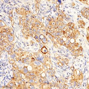 IHC检测MMP10蛋白(货号 GB112994). 样品: 人胆管癌, 4%多聚甲醛 (货号G1101) 固定12-24小时. 抗原修复: 柠檬酸抗原修复液(干粉, pH 6.0) (G1201), 98℃, 20分钟. —抗: 1: 2400稀释, 4℃ 孵育过夜. 二抗: HRP标记山羊抗兔IgG (H+L) (货号GB23303), 1: 200稀释, 室温孵育1小时. |