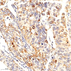 IHC检测MMP10蛋白(货号 GB112994). 样品: 人肺癌, 4%多聚甲醛 (货号G1101) 固定12-24小时. 抗原修复: 柠檬酸抗原修复液(干粉, pH 6.0) (G1201), 98℃, 20分钟. —抗: 1: 2400稀释, 4℃ 孵育过夜. 二抗: HRP标记山羊抗兔IgG (H+L) (货号GB23303), 1: 200稀释, 室温孵育1小时. |