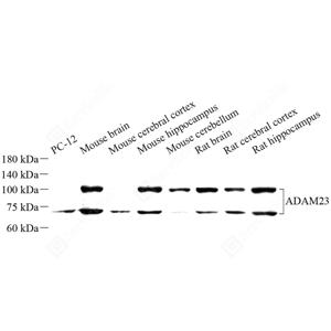 WB检测ADAM23蛋白(货号 GB111341). 样品: 经RIPA裂解液(货号G2002)处理的蛋白质. 封闭: 封闭: 3%脱脂牛奶(货号GC310001)溶于TBST溶液, 室温孵育1小时. —抗: 1: 500稀释, 4℃ 孵育过夜. 二抗: HRP标记山羊抗兔IgG (H+L) (货号GB23303), 1: 5000稀释, 室温孵育1小时. |