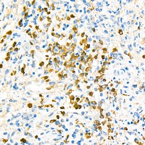 IHC检测S100P蛋白(货号 GB113949). 样品: 人扁桃体, 4%多聚甲醛 (货号G1101) 固定12-24小时. 抗原修复: 柠檬酸抗原修复液(干粉, pH 6.0) (G1201), 98℃, 20分钟. —抗: 1: 1000稀释, 4℃ 孵育过夜. 二抗: HRP标记山羊抗兔IgG (H+L) (货号GB23303), 1: 200稀释, 室温孵育1小时. |