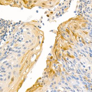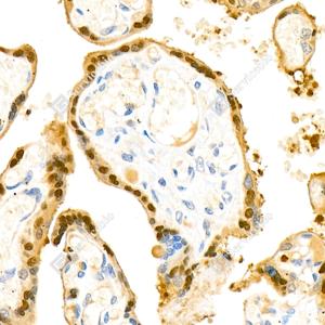 IHC检测S100P蛋白(货号 GB113949). 样品: 人胎盘, 4%多聚甲醛 (货号G1101) 固定12-24小时. 抗原修复: 柠檬酸抗原修复液(干粉, pH 6.0) (G1201), 98℃, 20分钟. —抗: 1: 1000稀释, 4℃ 孵育过夜. 二抗: HRP标记山羊抗兔IgG (H+L) (货号GB23303), 1: 200稀释, 室温孵育1小时. |