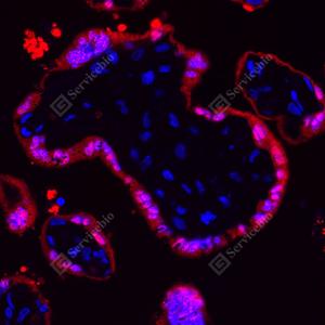 IF检测S100P蛋白(货号 GB113949)(红色). 样品: 人胎盘, 4%多聚甲醛 (货号G1101) 固定12-24小时. 抗原修复: Tris-EDTA抗原修复液(pH 9.0) (G1203), 98℃, 20分钟. 封闭: 3% BSA(货号GC305010)的PBS溶液, 室温孵育30分钟. —抗: 1: 1000稀释, 4℃ 孵育过夜. 二抗: Cy3标记山羊抗兔IgG (H+L) (货号GB21303), 1: 300稀释, 室温孵育1小时. |
