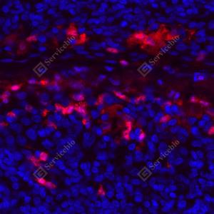 IF检测S100P蛋白(货号 GB113949)(红色). 样品: 人脾, 4%多聚甲醛 (货号G1101) 固定12-24小时. 抗原修复: Tris-EDTA抗原修复液(pH 9.0) (G1203), 98℃, 20分钟. 封闭: 3% BSA(货号GC305010)的PBS溶液, 室温孵育30分钟. —抗: 1: 1000稀释, 4℃ 孵育过夜. 二抗: Cy3标记山羊抗兔IgG (H+L) (货号GB21303), 1: 300稀释, 室温孵育1小时. |