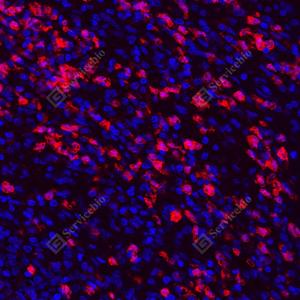 IF检测S100P蛋白(货号 GB113949)(红色). 样品: 人扁桃体, 4%多聚甲醛 (货号G1101) 固定12-24小时. 抗原修复: Tris-EDTA抗原修复液(pH 9.0) (G1203), 98℃, 20分钟. 封闭: 3% BSA(货号GC305010)的PBS溶液, 室温孵育30分钟. —抗: 1: 1000稀释, 4℃ 孵育过夜. 二抗: Cy3标记山羊抗兔IgG (H+L) (货号GB21303), 1: 300稀释, 室温孵育1小时. |