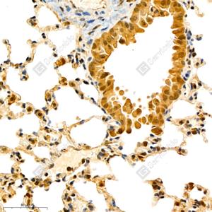 IHC检测S100A11蛋白(货号 GB111080). 样品: 小鼠肺, 4%多聚甲醛 (货号G1101) 固定12-24小时. 抗原修复: 柠檬酸抗原修复液(干粉, pH 6.0) (G1201), 98℃, 20分钟. —抗: 1: 500稀释, 4℃ 孵育过夜. 二抗: HRP标记山羊抗兔IgG (H+L) (货号GB23303), 1: 200稀释, 室温孵育1小时. |