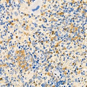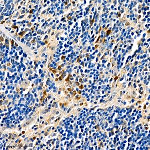 IHC检测S100A11蛋白(货号 GB111080). 样品: 小鼠脾, 4%多聚甲醛 (货号G1101) 固定12-24小时. 抗原修复: 柠檬酸抗原修复液(干粉, pH 6.0) (G1201), 98℃, 20分钟. —抗: 1: 500稀释, 4℃ 孵育过夜. 二抗: HRP标记山羊抗兔IgG (H+L) (货号GB23303), 1: 200稀释, 室温孵育1小时. |