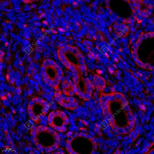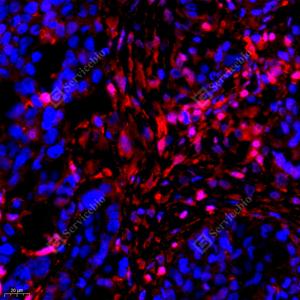 IF检测S100A11蛋白(货号 GB111080)(红色). 样品: 人卵巢癌, 4%多聚甲醛 (货号G1101) 固定12-24小时. 抗原修复: Tris-EDTA抗原修复液(pH 9.0) (G1203), 98℃, 20分钟. 封闭: 3% BSA(货号GC305010)的PBS溶液, 室温孵育30分钟. —抗: 1: 500稀释, 4℃ 孵育过夜. 二抗: Cy3标记山羊抗兔IgG (H+L) (货号GB21303), 1: 300稀释, 室温孵育1小时. |