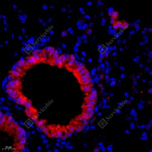 IF检测S100A11蛋白(货号 GB111080)(红色). 样品: 小鼠肺, 4%多聚甲醛 (货号G1101) 固定12-24小时. 抗原修复: Tris-EDTA抗原修复液(pH 9.0) (G1203), 98℃, 20分钟. 封闭: 3% BSA(货号GC305010)的PBS溶液, 室温孵育30分钟. —抗: 1: 500稀释, 4℃ 孵育过夜. 二抗: Cy3标记山羊抗兔IgG (H+L) (货号GB21303), 1: 300稀释, 室温孵育1小时. |