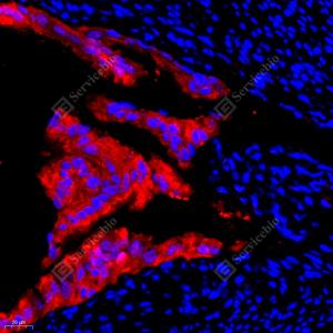 IF检测S100A11蛋白(货号 GB111080)(红色). 样品: 小鼠卵巢, 4%多聚甲醛 (货号G1101) 固定12-24小时. 抗原修复: Tris-EDTA抗原修复液(pH 9.0) (G1203), 98℃, 20分钟. 封闭: 3% BSA(货号GC305010)的PBS溶液, 室温孵育30分钟. —抗: 1: 500稀释, 4℃ 孵育过夜. 二抗: Cy3标记山羊抗兔IgG (H+L) (货号GB21303), 1: 300稀释, 室温孵育1小时. |