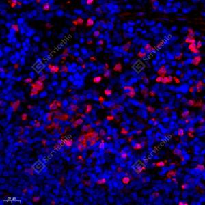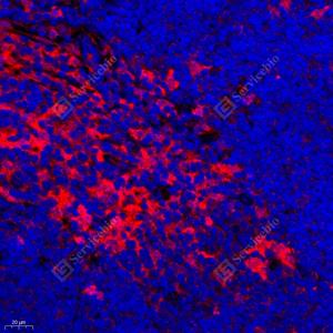 IF检测S100A11蛋白(货号 GB111080)(红色). 样品: 大鼠脾, 4%多聚甲醛 (货号G1101) 固定12-24小时. 抗原修复: Tris-EDTA抗原修复液(pH 9.0) (G1203), 98℃, 20分钟. 封闭: 3% BSA(货号GC305010)的PBS溶液, 室温孵育30分钟. —抗: 1: 500稀释, 4℃ 孵育过夜. 二抗: Cy3标记山羊抗兔IgG (H+L) (货号GB21303), 1: 300稀释, 室温孵育1小时. |