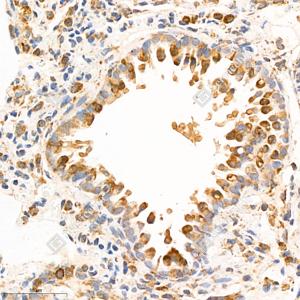 IHC检测CKAP4蛋白(货号 GB111437). 样品: 大鼠肺, 4%多聚甲醛 (货号G1101) 固定12-24小时. 抗原修复: 柠檬酸抗原修复液(干粉, pH 6.0) (G1201), 98℃, 20分钟. —抗: 1: 500稀释, 4℃ 孵育过夜. 二抗: HRP标记山羊抗兔IgG (H+L) (货号GB23303), 1: 200稀释, 室温孵育1小时. |