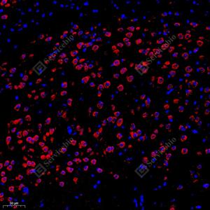 IF检测CKAP4蛋白(货号 GB111437)(红色). 样品: 小鼠脑, 4%多聚甲醛 (货号G1101) 固定12-24小时. 抗原修复: Tris-EDTA抗原修复液(pH 9.0) (G1203), 98℃, 20分钟. 封闭: 3% BSA(货号GC305010)的PBS溶液, 室温孵育30分钟. —抗: 1: 2000稀释, 4℃ 孵育过夜. 二抗: Cy3标记山羊抗兔IgG (H+L) (货号GB21303), 1: 300稀释, 室温孵育1小时. |