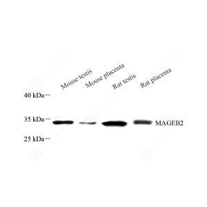 WB检测MAGEB2蛋白(货号 GB114649). 样品: 经RIPA裂解液(货号G2002)处理的蛋白质. 封闭: 封闭: 3%脱脂牛奶(货号GC310001)溶于TBST溶液, 室温孵育1小时. —抗: 1: 800稀释, 4℃ 孵育过夜. 二抗: HRP标记山羊抗兔IgG (H+L) (货号GB23303), 1: 5000稀释, 室温孵育1小时. |