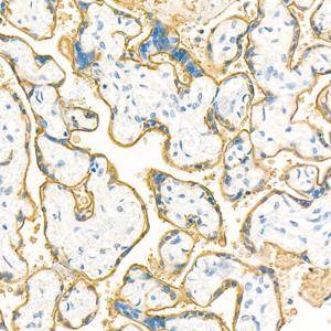 IHC检测Placental alkaline phosphatase (PLAP)蛋白(货号 GB112545). 样品: 人胎盘, 4%多聚甲醛 (货号G1101) 固定12-24小时. 抗原修复: Tris-EDTA抗原修复液(pH 9.0) (G1203), 98℃, 20分钟. —抗: 1: 400稀释, 4℃ 孵育过夜. 二抗: HRP标记山羊抗兔IgG (H+L) (货号GB23303), 1: 200稀释, 室温孵育1小时. |