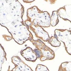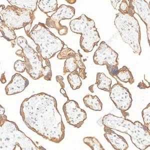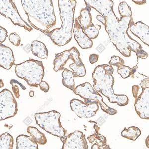 IHC检测Placental Alkaline Phosphatase (PLAP)蛋白(货号 GB152545). 样品: 人胎盘, 4%多聚甲醛 (货号G1101) 固定12-24小时. 抗原修复: 柠檬酸抗原修复液(干粉, pH 6.0) (G1201), 高压锅均匀喷气计时2分钟. —抗: 1: 500稀释, 4℃ 孵育过夜. 二抗: S-vision免疫组化多聚二抗(山羊抗小鼠), 即用型(货号G1301), 室温孵育20分钟. |