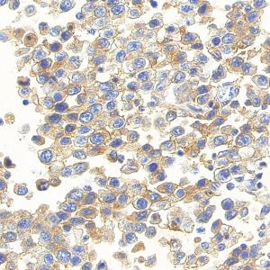 IHC检测Placental Alkaline Phosphatase (PLAP)蛋白(货号 GB152545). 样品: 人精原细胞瘤, 4%多聚甲醛 (货号G1101) 固定12-24小时. 抗原修复: 柠檬酸抗原修复液(干粉, pH 6.0) (G1201), 高压锅均匀喷气计时2分钟. —抗: 1: 500稀释, 4℃ 孵育过夜. 二抗: S-vision免疫组化多聚二抗(山羊抗小鼠), 即用型(货号G1301), 室温孵育20分钟. |