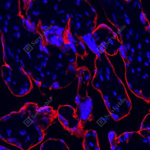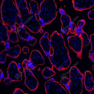 IF检测Placental Alkaline Phosphatase (PLAP)蛋白(货号 GB152545)(红色). 样品: 人胎盘, 4%多聚甲醛 (货号G1101) 固定12-24小时. 抗原修复: 柠檬酸抗原修复液(干粉, pH 6.0) (G1201), 高压锅均匀喷气计时2分钟. 封闭: 3% BSA(货号GC305010)的PBS溶液, 室温孵育30分钟. —抗: 1: 1000稀释, 4℃ 孵育过夜. 二抗: Cy3标记山羊抗小鼠IgG (H+L) (货号GB21301), 1: 300稀释, 室温孵育1小时. |