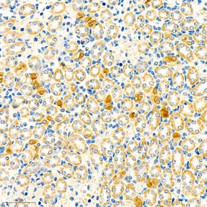 IHC检测PSCA蛋白(货号 GB11944). 样品: 大鼠肾, 4%多聚甲醛 (货号G1101) 固定12-24小时. 抗原修复: 柠檬酸抗原修复液(干粉, pH 6.0) (G1201), 98℃, 20分钟. —抗: 1: 1500稀释, 4℃ 孵育过夜. 二抗: HRP标记山羊抗兔IgG (H+L) (货号GB23303), 1: 200稀释, 室温孵育1小时. |
