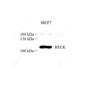 WB检测RECK蛋白(货号 GB114210). 样品: 经RIPA裂解液(货号G2002)处理的蛋白质. 封闭: 封闭: 3%脱脂牛奶(货号GC310001)溶于TBST溶液, 室温孵育1小时. —抗: 1: 600稀释, 4℃ 孵育过夜. 二抗: HRP标记山羊抗兔IgG (H+L) (货号GB23303), 1: 5000稀释, 室温孵育1小时. |