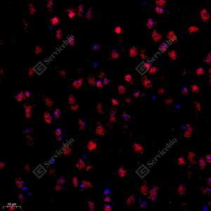 IF检测STRAD蛋白(货号 GB112208)(红色). 样品: 小鼠纹状体, 4%多聚甲醛 (货号G1101) 固定12-24小时. 抗原修复: Tris-EDTA抗原修复液(pH 9.0) (G1203), 98℃, 20分钟. 封闭: 3% BSA(货号GC305010)的PBS溶液, 室温孵育30分钟. —抗: 1: 600稀释, 4℃ 孵育过夜. 二抗: Cy3标记山羊抗兔IgG (H+L) (货号GB21303), 1: 300稀释, 室温孵育1小时. |