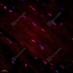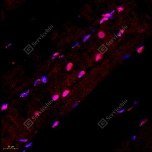 IF检测STRAD蛋白(货号 GB112208)(红色). 样品: 大鼠骨骼肌, 4%多聚甲醛 (货号G1101) 固定12-24小时. 抗原修复: Tris-EDTA抗原修复液(pH 9.0) (G1203), 98℃, 20分钟. 封闭: 3% BSA(货号GC305010)的PBS溶液, 室温孵育30分钟. —抗: 1: 600稀释, 4℃ 孵育过夜. 二抗: Cy3标记山羊抗兔IgG (H+L) (货号GB21303), 1: 300稀释, 室温孵育1小时. |
