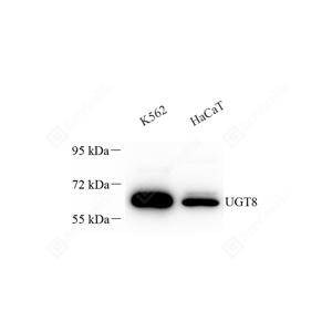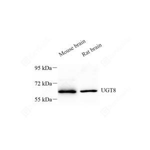 WB检测UGT8蛋白(货号 GB113923). 样品: 经RIPA裂解液(货号G2002)处理的蛋白质. 封闭: 封闭: 3%脱脂牛奶(货号GC310001)溶于TBST溶液, 室温孵育1小时. —抗: 1: 1000稀释, 4℃ 孵育过夜. 二抗: HRP标记山羊抗兔IgG (H+L) (货号GB23303), 1: 5000稀释, 室温孵育1小时. |