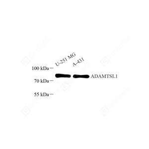 WB检测ADAMTSL1蛋白(货号 GB115331). 样品: 经RIPA裂解液(货号G2002)处理的蛋白质. 封闭: 3%脱脂牛奶(货号GC310001)溶于TBST溶液, 室温孵育1小时. —抗: 1: 600稀释, 4℃ 孵育过夜. 二抗: HRP标记山羊抗兔IgG (H+L) (货号GB23303), 1: 5000稀释, 室温孵育1小时. |