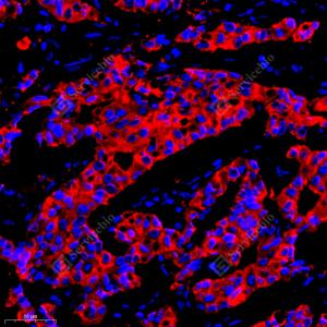 IF检测AG-3蛋白(货号 GB111744)(红色). 样品: 人乳腺癌, 4%多聚甲醛 (货号G1101) 固定12-24小时. 抗原修复: Tris-EDTA抗原修复液(pH 9.0) (G1203), 98℃, 20分钟. 封闭: 3% BSA(货号GC305010)的PBS溶液, 室温孵育30分钟. —抗: 1: 800稀释, 4℃ 孵育过夜. 二抗: Cy3标记山羊抗兔IgG (H+L) (货号GB21303), 1: 300稀释, 室温孵育1小时. |