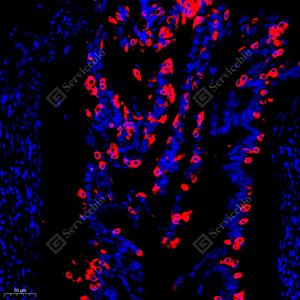 IF检测AG-3蛋白(货号 GB111744)(红色). 样品: 人子宫, 4%多聚甲醛 (货号G1101) 固定12-24小时. 抗原修复: Tris-EDTA抗原修复液(pH 9.0) (G1203), 98℃, 20分钟. 封闭: 3% BSA(货号GC305010)的PBS溶液, 室温孵育30分钟. —抗: 1: 800稀释, 4℃ 孵育过夜. 二抗: Cy3标记山羊抗兔IgG (H+L) (货号GB21303), 1: 300稀释, 室温孵育1小时. |