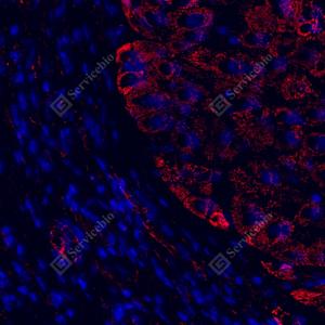 IF检测EIPR1蛋白(货号 GB114481)(红色). 样品: 人肝癌, 4%多聚甲醛 (货号G1101) 固定12-24小时. 抗原修复: Tris-EDTA抗原修复液(pH 9.0) (G1203), 98℃, 20分钟. 封闭: 3% BSA(货号GC305010)的PBS溶液, 室温孵育30分钟. —抗: 1: 800稀释, 4℃ 孵育过夜. 二抗: Cy3标记山羊抗兔IgG (H+L) (货号GB21303), 1: 300稀释, 室温孵育1小时. |