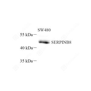 WB检测SERPINB8蛋白(货号 GB114336). 样品: 经RIPA裂解液(货号G2002)处理的蛋白质. 封闭: 封闭: 3%脱脂牛奶(货号GC310001)溶于TBST溶液, 室温孵育1小时. —抗: 1: 1000稀释, 4℃ 孵育过夜. 二抗: HRP标记山羊抗兔IgG (H+L) (货号GB23303), 1: 5000稀释, 室温孵育1小时. |