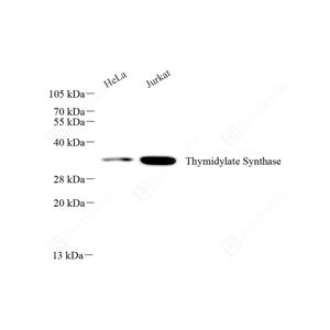WB检测Thymidylate Synthase蛋白(货号 GB115510). 样品: 经RIPA裂解液(货号G2002)处理的蛋白质. 封闭: 封闭: 3%脱脂牛奶(货号GC310001)溶于TBST溶液, 室温孵育1小时. —抗: 1: 300稀释, 4℃ 孵育过夜. 二抗: HRP标记山羊抗兔IgG (H+L) (货号GB23303), 1: 5000稀释, 室温孵育1小时. |