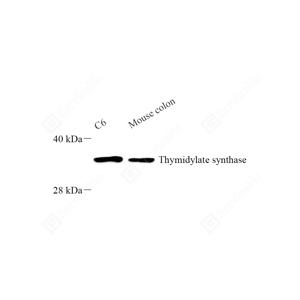 WB检测Thymidylate Synthase蛋白(货号 GB122057). 样品: 经RIPA裂解液(货号G2002)处理的蛋白质. 封闭: 封闭: 3%脱脂牛奶(货号GC310001)溶于TBST溶液, 室温孵育1小时. —抗: 1: 500稀释, 4℃ 孵育过夜. 二抗: HRP标记山羊抗小鼠IgG (H+L) (货号GB23301), 1: 5000稀释, 室温孵育1小时. |