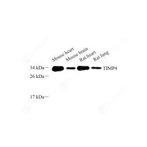WB检测TIMP4蛋白(货号 GB112268). 样品: 经RIPA裂解液(货号G2002)处理的蛋白质. 封闭: 封闭: 3%脱脂牛奶(货号GC310001)溶于TBST溶液, 室温孵育1小时. —抗: 1: 500稀释, 4℃ 孵育过夜. 二抗: HRP标记山羊抗兔IgG (H+L) (货号GB23303), 1: 5000稀释, 室温孵育1小时. |