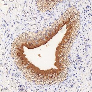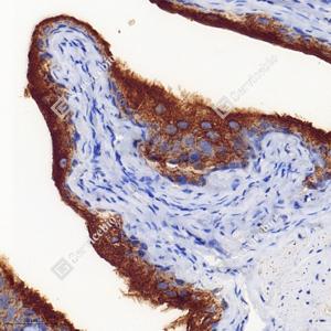 IHC检测Uroplakin Ia蛋白(货号 GB113288). 样品: 小鼠膀胱, 4%多聚甲醛 (货号G1101) 固定12-24小时. 抗原修复: 柠檬酸抗原修复液(干粉, pH 6.0) (G1201), 98℃, 20分钟. —抗: 1: 3000稀释, 4℃ 孵育过夜. 二抗: HRP标记山羊抗兔IgG (H+L) (货号GB23303), 1: 200稀释, 室温孵育1小时. |