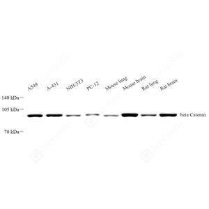 WB检测beta Catenin蛋白(货号 YB15026). 样品: 经RIPA裂解液(货号Y2013)处理的蛋白质. 封闭: 3%脱脂牛奶(货号YC310012)溶于TBST溶液, 室温孵育1小时. —抗: 1: 500稀释, 4℃ 孵育过夜. 二抗: HRP标记山羊抗兔IgG (H+L) (货号YB23314), 1: 5000稀释, 室温孵育1小时. |
