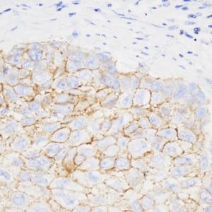 IHC检测beta Catenin蛋白(货号 YB15026). 样品: 人食管癌, 4%多聚甲醛 (货号Y1112) 固定12-24小时. 抗原修复: 柠檬酸抗原修复液(干粉, pH 6.0) (Y1212), 高压锅均匀喷气计时2分钟. —抗: 1: 1000稀释, 4℃ 孵育过夜. 二抗: HRP标记山羊抗兔IgG (H+L) (货号YB23314), 1: 200稀释, 室温孵育1小时. |