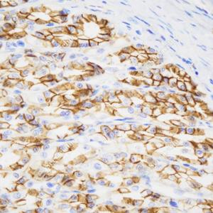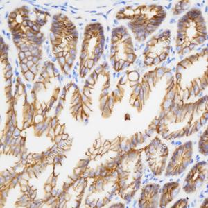 IHC检测beta Catenin蛋白(货号 YB15026). 样品: 大鼠胃, 4%多聚甲醛 (货号Y1112) 固定12-24小时. 抗原修复: 柠檬酸抗原修复液(干粉, pH 6.0) (Y1212), 高压锅均匀喷气计时2分钟. —抗: 1: 1000稀释, 4℃ 孵育过夜. 二抗: HRP标记山羊抗兔IgG (H+L) (货号YB23314), 1: 200稀释, 室温孵育1小时. |