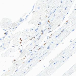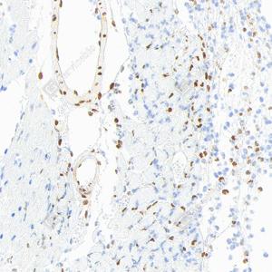 IHC检测HIF-1 alpha蛋白(货号 YB151350). 样品: 小鼠心脏缺血再灌注损伤, 4%多聚甲醛 (货号Y1112) 固定12-24小时. 抗原修复: Tris-EDTA抗原修复液(pH 9.0) (Y1214), 98℃, 20分钟. —抗: 1: 1000稀释, 4℃ 孵育过夜. 二抗: S-vision免疫组化多聚二抗(山羊抗兔),即用型 (货号Y1313), 室温孵育20分钟. |