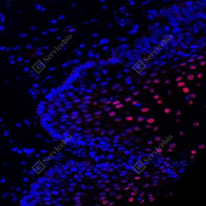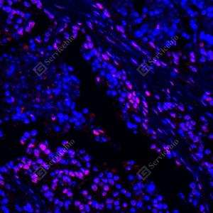 IF检测HIF-1 alpha蛋白(货号 YB151350)(红色). 样品: 人卵巢癌, 4%多聚甲醛 (货号Y1112) 固定12-24小时. 抗原修复: Tris-EDTA抗原修复液(pH 9.0) (Y1214), 98℃, 20分钟. 封闭: 3% BSA(货号YC305021)的PBS溶液, 室温孵育30分钟. —抗: 1: 600稀释, 4℃ 孵育过夜. 二抗: Cy3标记山羊抗兔IgG (H+L) (货号YB21314), 1: 300稀释, 室温孵育1小时. |