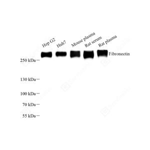 WB检测Fibronectin蛋白(货号 YB152104). 样品: 经RIPA裂解液(货号Y2013)处理的蛋白质. 封闭: 3%脱脂牛奶(货号YC310012)溶于TBST溶液, 室温孵育1小时. —抗: 1: 500稀释, 4℃ 孵育过夜. 二抗: HRP标记山羊抗兔IgG (H+L) (货号YB23314), 1: 5000稀释, 室温孵育1小时. |
