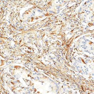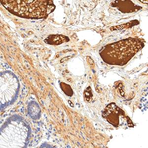 IHC检测Fibronectin蛋白(货号 YB152104). 样品: 人结肠, 4%多聚甲醛 (货号Y1112) 固定12-24小时. 抗原修复: 柠檬酸抗原修复液(干粉, pH 6.0) (Y1212), 高压锅均匀喷气计时2分钟. —抗: 1: 3000稀释, 4℃ 孵育过夜. 二抗: S-vision免疫组化多聚二抗(山羊抗兔),即用型 (货号Y1313), 室温孵育20分钟. |