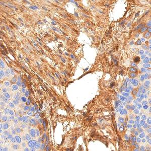IHC检测Fibronectin蛋白(货号 YB152104). 样品: 人食管癌, 4%多聚甲醛 (货号Y1112) 固定12-24小时. 抗原修复: 柠檬酸抗原修复液(干粉, pH 6.0) (Y1212), 高压锅均匀喷气计时2分钟. —抗: 1: 3000稀释, 4℃ 孵育过夜. 二抗: S-vision免疫组化多聚二抗(山羊抗兔),即用型 (货号Y1313), 室温孵育20分钟. |