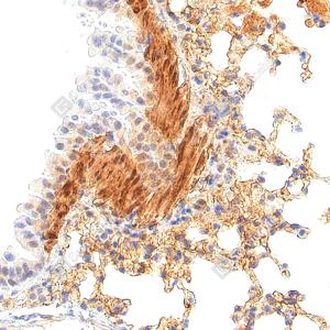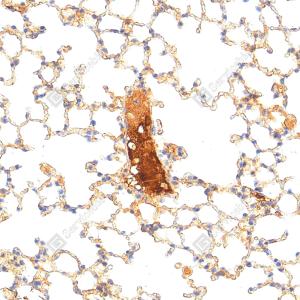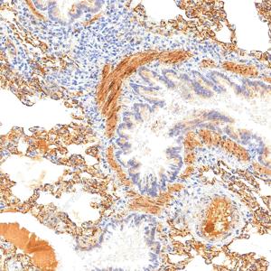 IHC检测Fibronectin蛋白(货号 YB152104). 样品: 小鼠肺, 4%多聚甲醛 (货号Y1112) 固定12-24小时. 抗原修复: 柠檬酸抗原修复液(干粉, pH 6.0) (Y1212), 高压锅均匀喷气计时2分钟. —抗: 1: 3000稀释, 4℃ 孵育过夜. 二抗: S-vision免疫组化多聚二抗(山羊抗兔),即用型 (货号Y1313), 室温孵育20分钟. |