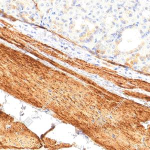 IHC检测Fibronectin蛋白(货号 YB152104). 样品: 大鼠胃, 4%多聚甲醛 (货号Y1112) 固定12-24小时. 抗原修复: 柠檬酸抗原修复液(干粉, pH 6.0) (Y1212), 高压锅均匀喷气计时2分钟. —抗: 1: 3000稀释, 4℃ 孵育过夜. 二抗: S-vision免疫组化多聚二抗(山羊抗兔),即用型 (货号Y1313), 室温孵育20分钟. |