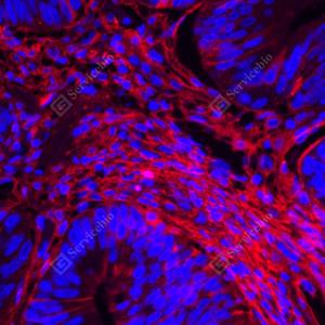 IF检测Fibronectin蛋白(货号 YB152104)(红色). 样品: 人结肠癌, 4%多聚甲醛 (货号Y1112) 固定12-24小时. 抗原修复: 柠檬酸抗原修复液(干粉, pH 6.0) (Y1212), 高压锅均匀喷气计时2分钟. 封闭: 3% BSA(货号YC305021)的PBS溶液, 室温孵育30分钟. —抗: 1: 3000稀释, 4℃ 孵育过夜. 二抗: Cy3标记山羊抗兔IgG (H+L) (货号YB21314), 1: 300稀释, 室温孵育1小时. |